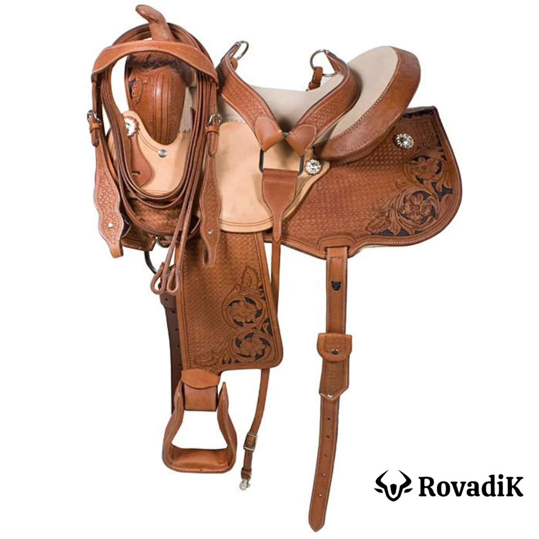Rovadik Handmade Western Show Saddle Set – Tooled Leather Horse Saddle with Matching Headstall, Breast Collar & Reins – Comfortable Trail & Show Riding
